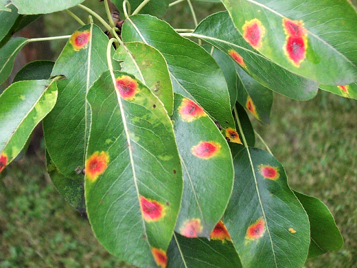 Листва снизу покрывается рыжими пятнами и рано опадает. Источником болезни растения может быть можжевельник.