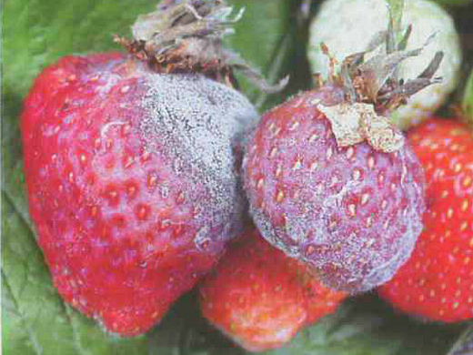 Массовое заражение дачных посадок происходит в пасмурную погоду. Если год удался дождливым, можно потерять практически весь урожай. Ягоды становятся светло-коричневыми и покрываются белым или сероватым пушком, вскоре сохнут и мумифицируются прямо на кусте, заражая при этом соседние плоды. На завязи и плодоножках клубники появляются окольцовывающие пятна бурого или темно-серого цвета и засыхают.