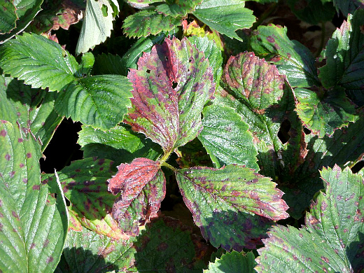 Заболевание проявляется ближе к середине лета. На листочках появляются темные пятна пурпурного цвета. В них располагаются споры гриба. Темные подушечки лопаются в дождливую погоду, и болезнь распространяется на соседние кусты клубники. Пораженные листочки отмирают, что плохо сказывается на будущем урожае.