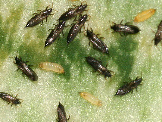 Небольшие насекомые поселяются в соцветиях, повреждают завязи и плоды. Ягоды становятся бледными, на них появляются бурые пятна. Вредители любят жаркую и влажную погоду, поэтому это время является наиболее эффективным для борьбы с вредителями. Личинки трипсов желтого цвета, а взрослые особи — черного.