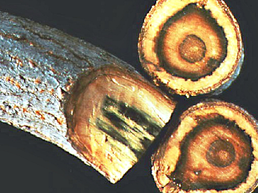 Кора и камбий на больных ветках усыхают кольцеобразно, отчего отмирают лишённые питания участки куста. К концу лета поражённые ветви стоят с плодами, но без листьев.