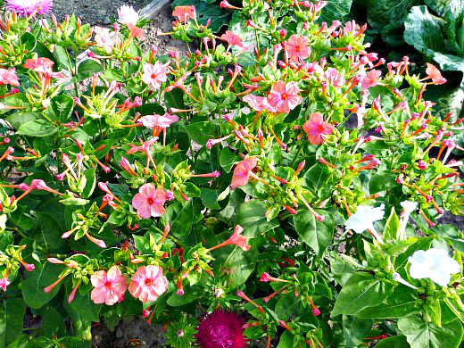 Мирабилис (и лучше в группе) славно украсит любую клумбу. Растение с пышным кустом, покрытым как многочисленными бутонами, так и распустившимися цветками. Расцветки их разные — от белых до сиреневых. Соцветия мирабилиса похожи на душистый табак. Цветы распускаются ближе к сумеркам (а также в дождь и пасмурную погоду), а закрываются только с рассветом.