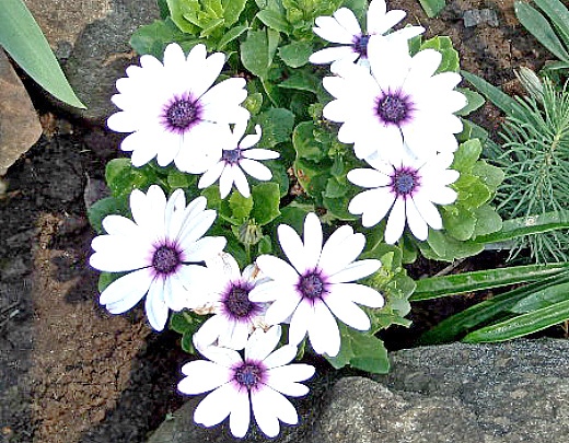 Крупные (4,5 см) белые ромашковидные соцветия язычковообразной формы имеют серединку синего цвета. Некоторые сорта остеоспермума имеют другой окрас соцветий: лиловый, желтый, оранжевый и их оттенки. Лучше цветы растут на плодородных грунтах.