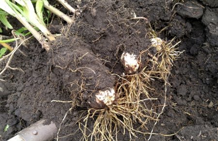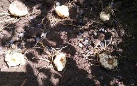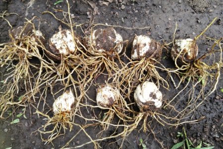 4. Выкопанные гнезда разделите на отдельные луковицы, они легко разделяются пальцами, нож для работы не нужен. Мелкие луковицы – детки выберите из надлуковичных корней, после пересадки они быстро развиваются в полноценные луковицы.