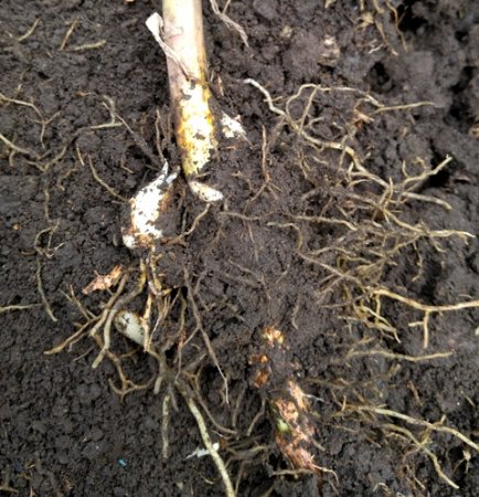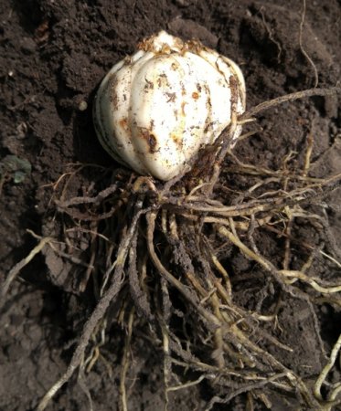 5. Разделённые луковицы очистите от земли, но корни их обрезать нельзя, только немного укоротить слишком длинные корни. Стебель с надлуковичными корнями обрежьте секатором у вершины луковицы или выкрутить до основания.