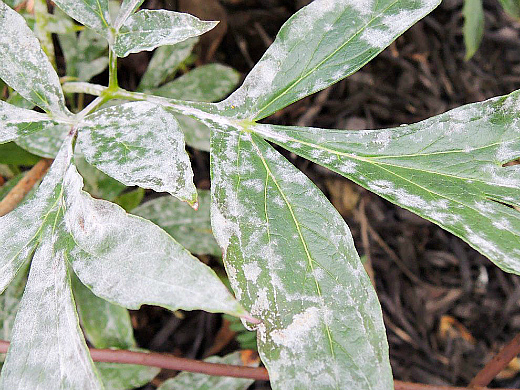 Пионы могут поражаться и другим грибковым заболеванием — мучнистой росой, проявляющимся белым налетом на листьях.