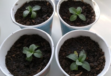 Всходы эустомы очень маленькие, кажется, что первый месяц они почти не растут, четыре зеленых листика лишь немного увеличиваются в размерах. В этот период для рассады эустомы необходима температура около +20 градусов. Поливать маленькие всходы нужно очень осторожно, из пульверизатора или из поддона. Земля в плошке всегда должна быть немного влажной, но не сырой. Если в комнате жарко, субстрат будет быстро высыхать, а даже при кратковременном пересыхании земли нежные всходы могут погибнуть. Для сохранения влажности можно накрыть посевы прозрачным пакетом, сделать в нем небольшие отверстия и каждый день проветривать, чтобы поверхность земли не заплесневела.
