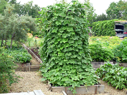 При помощи вьющейся фасоли особо трудолюбивые создают фон для других цветов, хотя и сама она очень красиво смотрится на заборе или беседке в саду: её маленькие цветочки разного окраса похожи на бисеринки среди зелёной листвы. Такое украшение порадует взор даже в пасмурную погоду.
