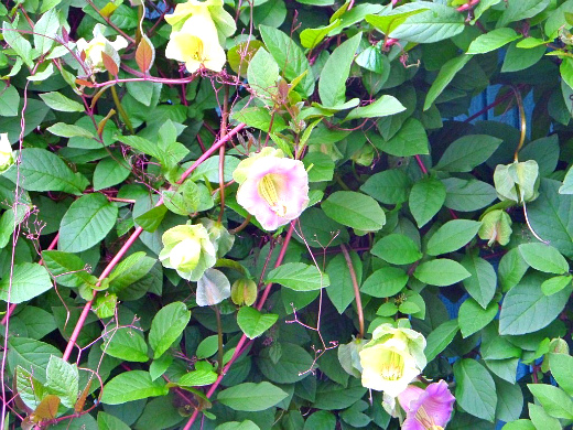 Рассаду кобеи мы высаживаем на даче в открытый грунт под пластиковые бутылки в середине мая. Эта лиана отлично подходит для декорирования забора, пергол или беседки в саду. Кобея очень быстро растет, так что к июлю забор превратится в красивый ковер, который осенью (или ближе к ней) украсят похожие на маленькие граммофоны белые, малиновые, фиолетовые и розовые цветы. В уходе лиана не очень привередлива. Ей требуется периодический полив и внесение удобрений. Всё вышеперечисленное подходит и для ипомеи.