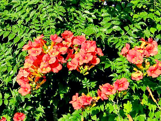 Теплолюбивая лиана, имеющая цветы ярко-оранжевого цвета, похожие на граммофоны. Листва у этого вьюна очень пышная и не менее красивая, чем цветки. Цвести лиана начинает в конце июня. Кампсис очень сильно и быстро разрастается, поэтому обязательно нужно обрезать лишние побеги. Растение боится сильных морозов, потому на время холодов его необходимо убирать с улицы.