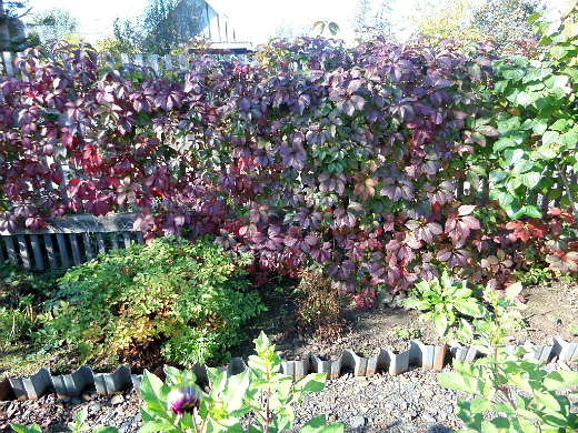 Его лианы дают возможность озеленить забор, прилагая к этому минимум затрат, как по части труда, так и финансов. Этот вьющийся виноград — обладатель плотных листьев больших размеров. Сами листья, в свою очередь, состоят из 5 остреньких овальных листочков. Цветки этого винограда неприметные, а ягоды нельзя употреблять в пищу. Но растение — красивое само по себе, летом будет радовать своим насыщенным зелёным цветом, а осенью его окрас поменяется, становясь пурпурным. Рост лиан радует своей агрессивностью, но сиё заставляет тратить время на их необходимую стрижку, по крайней мере, мне. 20 метров длины, знаете ли (а именно такой длины они могут достигать), совершенно излишни на дачном участке в 8 соток.