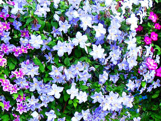 Растение, у которого побеги сплошь и рядом покрываются яркими звёздчатыми цветами большого размера. Клематис любит свет, однако прикорневая часть должна находиться в полутени. При поливе этого вьющегося необходимо следить, дабы влага не попадала на корни, чтобы избежать прикорневой гнили. Клематис нуждается в периодических подкормках. Если почва обеднеет или загущаются побеги, он перестанет цвести. Чтобы этого не случилось, необходимо своевременно убирать лишние новые ростки.