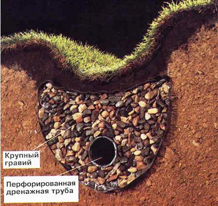 Простейший дренаж устраивают следующим образом. Снимают плодородный слой. Накидывают на неплодородную подпочву слой гравия, камней или битого кирпича высотой 0-15 см и хорошо утрамбовывают. Затем укладывают песок слоем 10 см и также уплотняют. После этого подсыпают слой плодородной земли в 10-15 см и прикатывают катком массой не менее 100-120 кг.