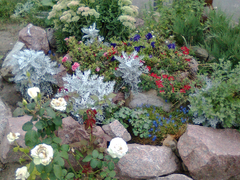 На небольшом возвышении земли с камнями у основания прекрасно будут смотреться седум (2-3 вида), красочные розетки молодила и многолетний алиссум (виды — серебристый, скальный, горный).