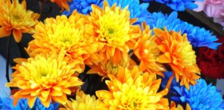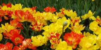 Желто-зеленая листва может хорошо сочетаться с оранжевыми и красными цветами.