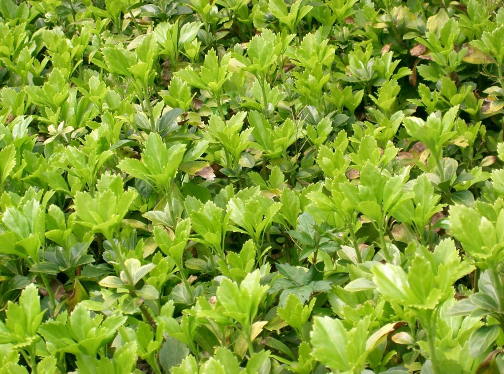 Лучше всего для этой цели подойдет пахизандра верхушечная — длиннокорневищный полукустарник с недревеснеющими побегами, образующий густые заросли из полегающих стеблей высотой 30-35 см с гремя ярусами листьев. Листья яйцевидные, плотные, темно-зеленые, с неровными краями.