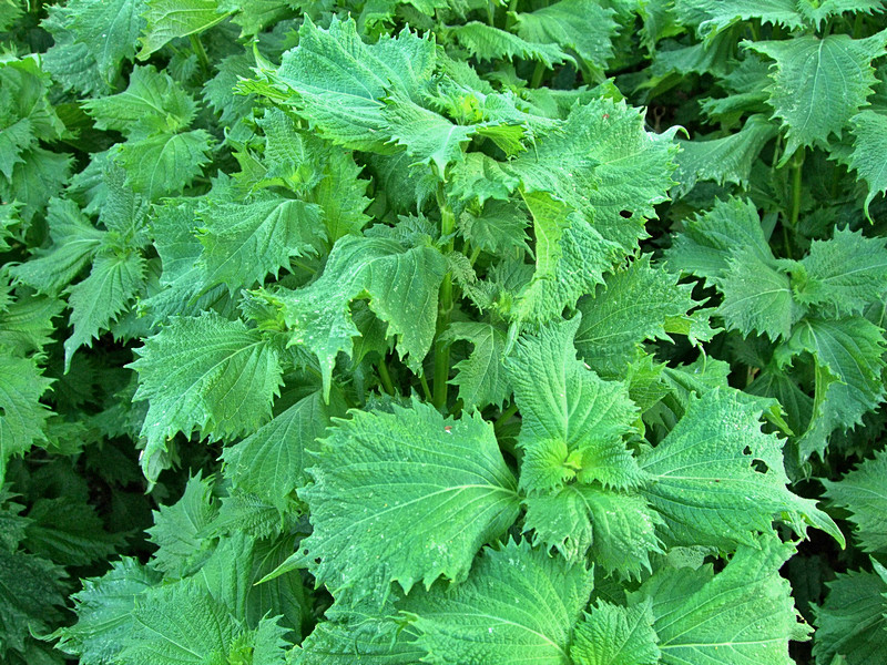Мы советуем посадить периллу нанкинскую, которая образует раскидистые кусты высотой 40-60 см. Листья у нее темно-пурпурные, почти черные. Цветки мелкие, зеленоватые. Размножают это растение семенами, которые высевают в начале апреля, всходы пикируют. Для получения компактной формы куста рассаду прищипывают.