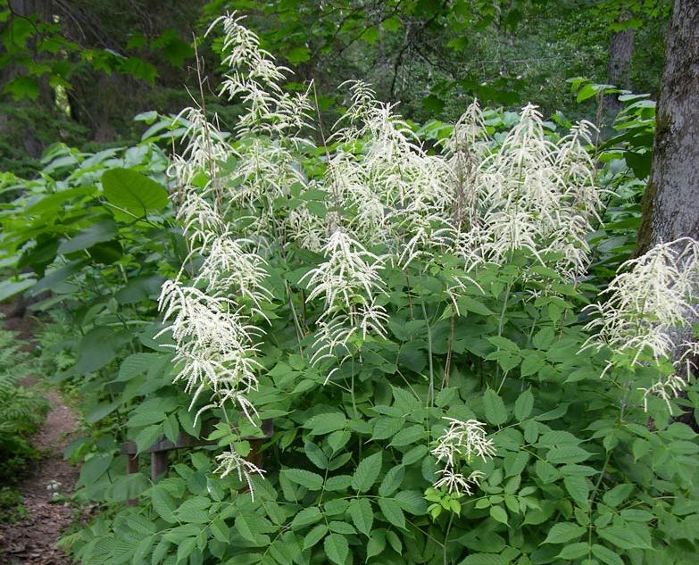 Волжанка азиатская достигает высоты человеческого роста, а то и больше. Цветки густо покрывают высокое метельчатое соцветие, а сложные листья длиной до 50-70 см красиво обрамляют крупную приземную розетку. В конце июня — начале июля это выносливо* растение становится одним из главных украшений сада. Оно эффектно смотрится у заборов, в полутени, в солитерных посадках на газоне.