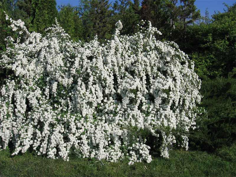 Пожалуй, наиболее эффектна спирея Бумальда. Этот вид представляет собой низкорослый кустарник до 80 см с прямостоячими побегами и темно-розовыми или белыми цветами.