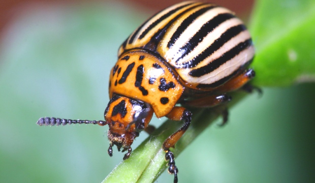Колорадский жук — один из самых известных огородных вредителей. Обитает на картофеле, томате, перце и других представителях семейства пасленовых. Данное насекомое имеет округло-овальное сильновыпуклое тело диаметром не более 1 см, надкрылья желтой или бело-желтой окраски. Характерным признаком данного вида насекомых является наличие 10 угольно-черных продольных полос и черная окраска головы. Колорадский жук откладывает яйца на нижние стороны листовых пластинок, через 7—9 дней появляются первые личинки овальных очертаний, окрашенные в светло-розовый или оранжевый цвет с цепочкой темных пятен вдоль брюшной части. Каждая личинка имеет 3 пары мелких ножек и черную головку, хорошо заметную на фоне светлого тела. Несколько личинок за достаточно короткий срок способны полностью уничтожить листья взрослого растения. При наличии благоприятных условий за один вегетативный сезон на огороде может смениться 3 поколения колорадского жука. Куколки данного насекомого обычно зимуют в толще субстрата.
