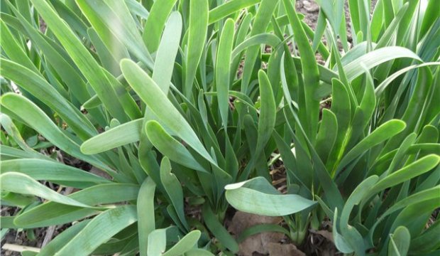 Толщина подземного побега может достигать 2—2,5 см. Стебель уплощенный, до полуметра в высоту, листья также плоские, с гладкой поверхностью, собранные у основания в пучки по 5—8 штук. Листья и стебли по запаху напоминают чеснок, но обладают менее выраженным вкусом.