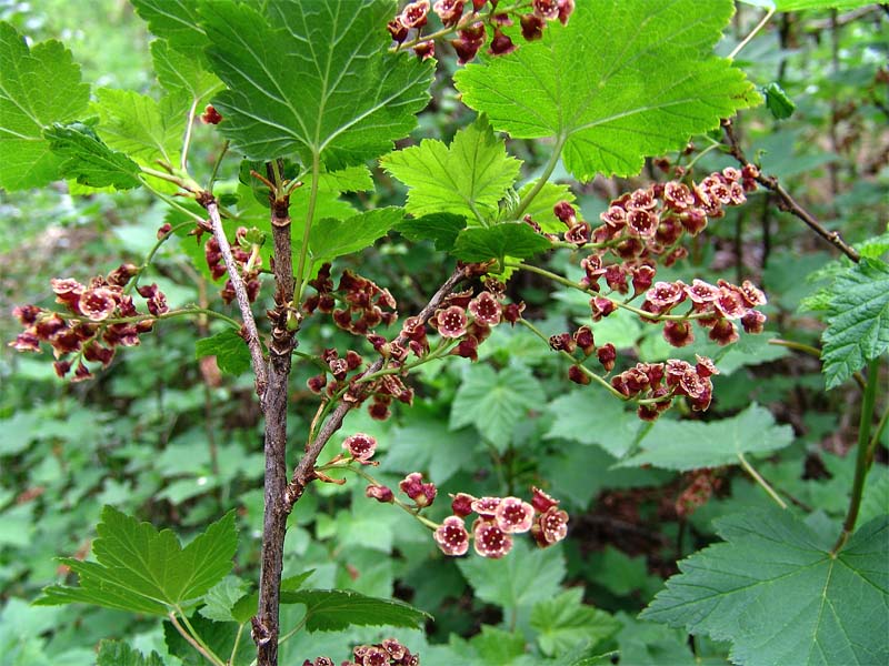 Кустарник высотой 2-3 м. Листья крупные, с 3-5 лопастями, темно-зеленые, снизу сильно опушенные. Цветки красные, собраны в кисти. Цветет ежегодно, с 3 лет, с середины мая, в течение 3 недель. Плоды черные, кисловатые, довольно крупные, приятного вкуса, с сизым налетом. Созревают в начале июля. Плодоносит с пяти лет.